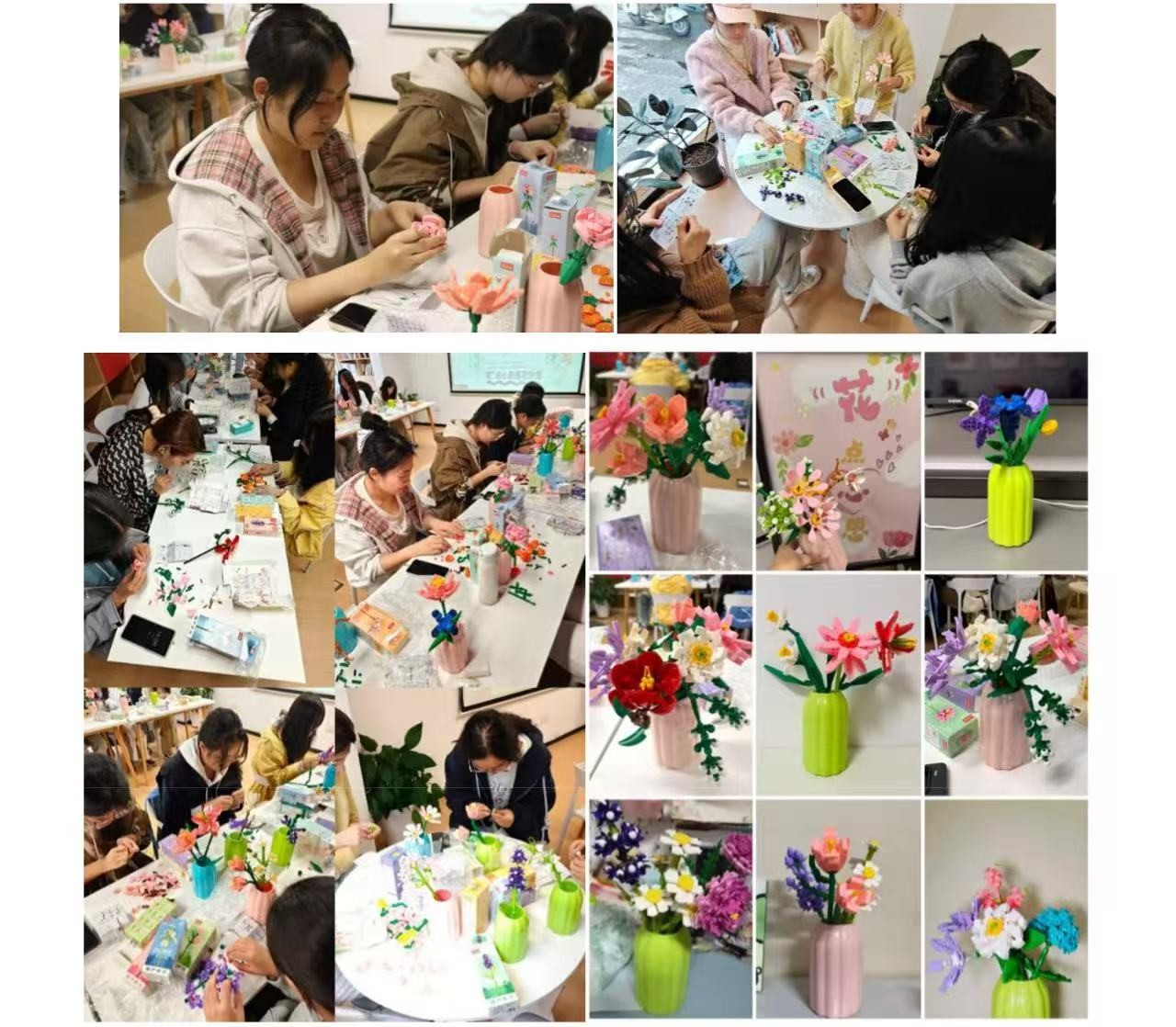 创意花艺活动深度融合心理学表达性艺术治疗理念,以手工创作为情感出口,助力参与者释放情绪、舒缓压力。活动以色彩丰富的积木为创作媒介,让同学们在拼搭、组合的趣味过程中,将奇思妙想转化为永不凋零的花朵。活动现场,大家相互探讨、互助协作,在专注投入的创作过程中稳定情绪,舒缓压力,在轻松融洽的互动中拉近了彼此距离。