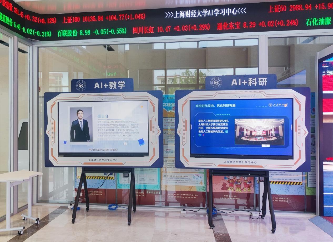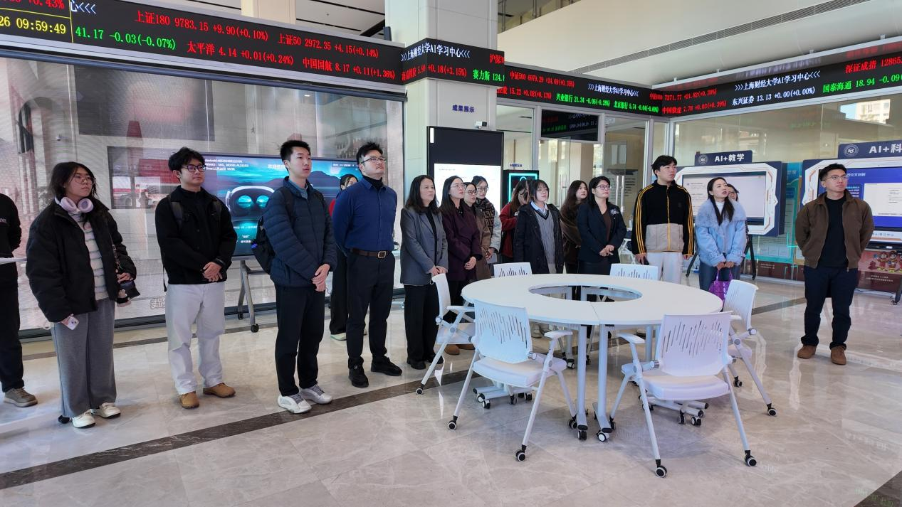 师生代表实地参观了AI学习中心的沉浸式数字人、全真模拟的金融交易场景以及跨学科智能体平台,过程中双方就如何运用人工智能技术赋能财经专业教学、搭建学生科创实践载体等具体问题进行了交流。