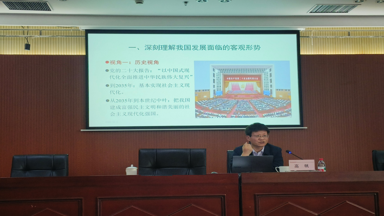 高帆介绍了党的二十届四中全会基本情况,并从历史视角、全球视角、时代视角、结构视角,分析了我国“十五五”时期国民经济和社会发展所面临的客观形势;从“培育壮大新兴产业和未来产业”“统筹教育强国、科技强国、人才强国建设”“全面增强自主创新能力”等方面阐释了我国“十五五”时期发展经济的重点任务;并结合上海、山东等地企业发展的成功案例,从坚持进一步全面深化改革,注重运用改革办法破解发展难题,为发展增动力、激活力,论证了地区发展的路径选择。