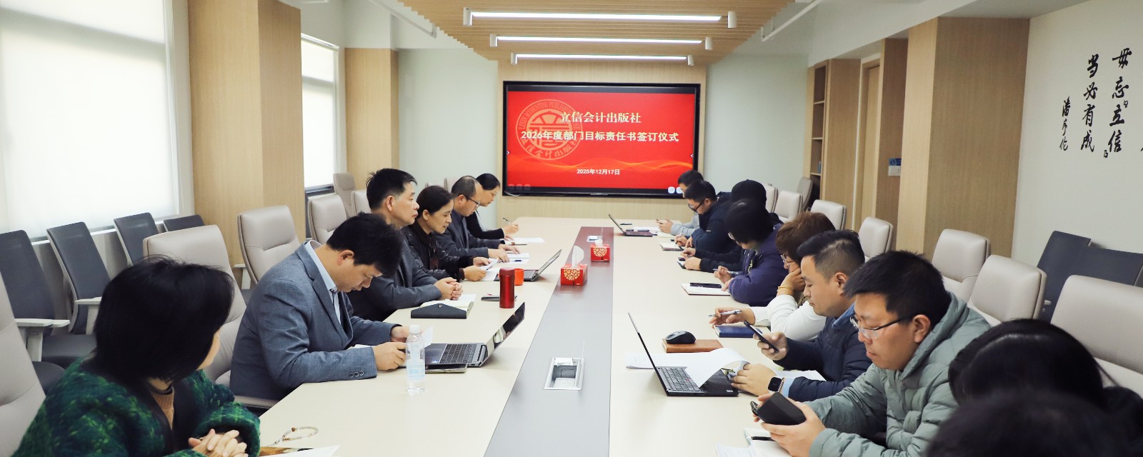 12月17日,立信会计出版社举行2026年度部门目标责任书签订仪式,出版社领导班子成员及全体中层干部参加。仪式由出版社党总支书记赵新民主持。