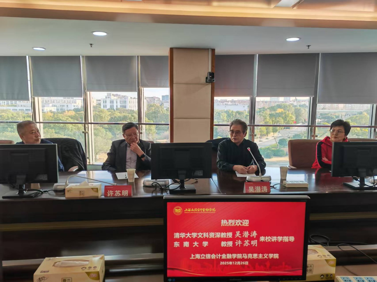 12月26日,马克思主义学院特邀清华大学文科资深教授吴潜涛、东南大学许苏明教授来校讲学指导。学院院长刘经伟主持会议,学院党政领导班子成员、青年教师参加会议。
