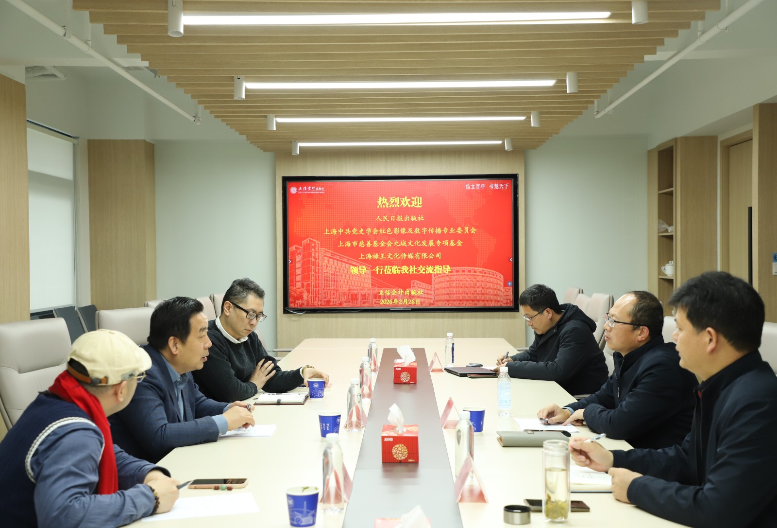 2月26日,人民日报出版社副社长赵军、上海中共党史学会红色影像及数字传播专业委员会副主任傅志皓、上海市慈善基金会九城文化发展专项基金主任黄净松一行到访立信会计出版社。出版社社长牛培源等接待了来宾。大家围绕出版行业转型、产品线更新、数字化转型、多元业务拓展和跨界合作等展开深入探讨。
