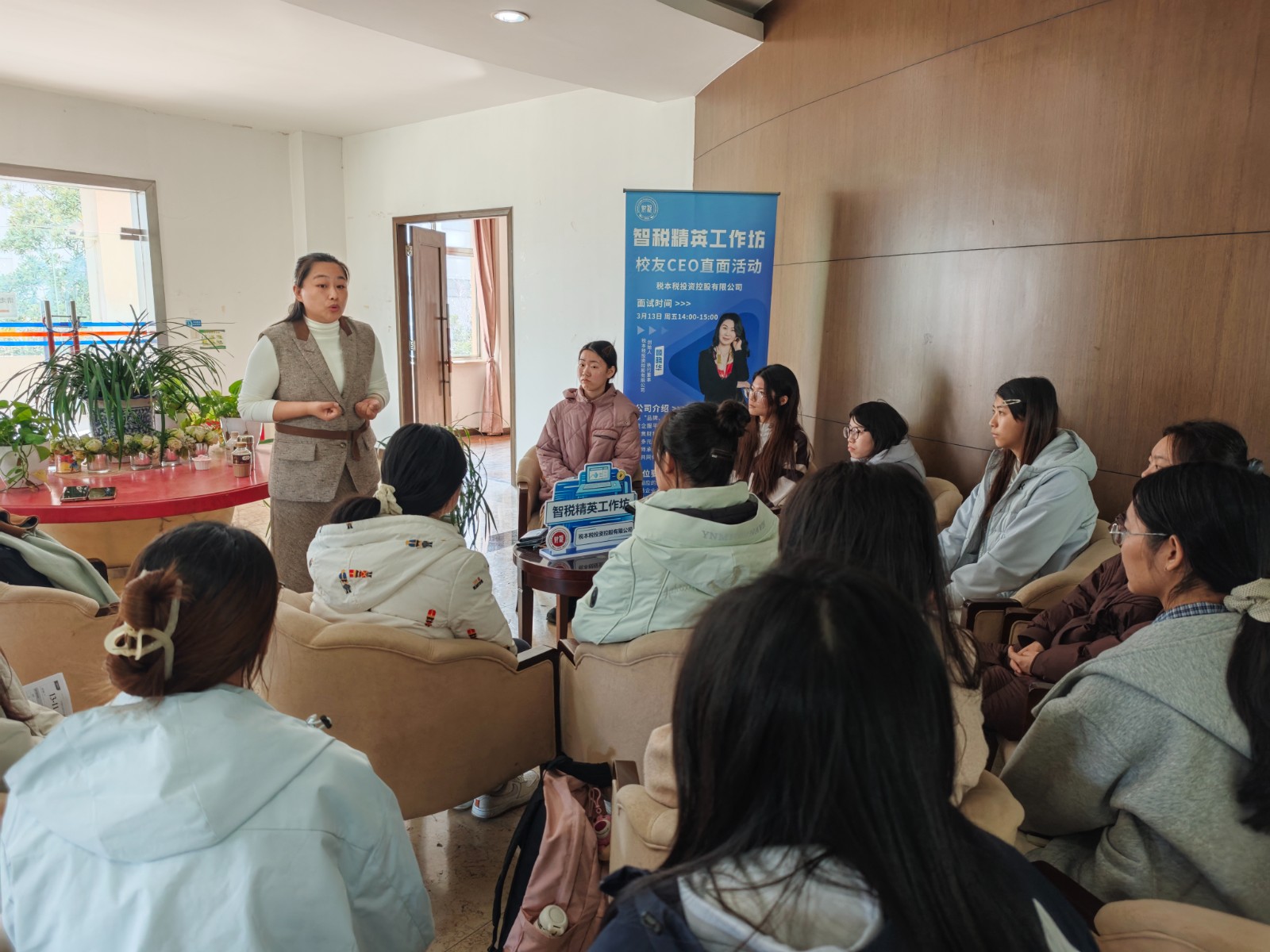 3月13日,校友企业税本税投资控股有限公司走进财税与公共管理学院,校企携手开展“智税精英工作坊”校友CEO直面活动。学院党委书记王亭,公司创始人、学院2003届校友顾晓华及其合伙人团队与学院税收学专业学生参加活动。