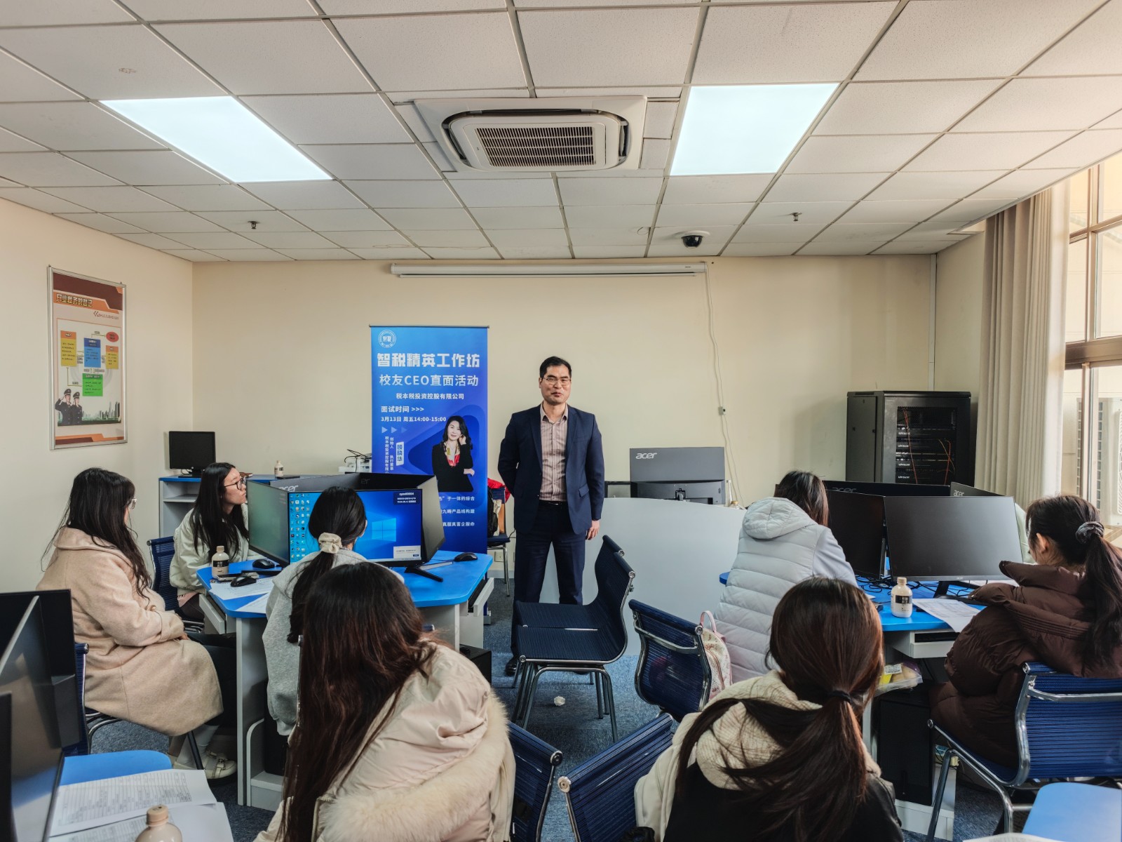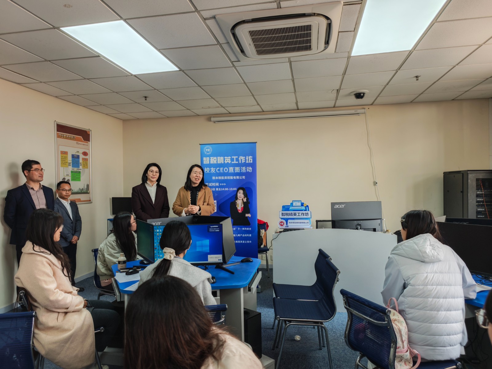 顾晓华结合自身丰富的职业发展经历,向现场学生详细介绍了公司的发展历程、企业文化及实习岗位的具体要求。随后,师生与企业嘉宾前往学院智慧税务模拟实验室,依托实景化的教学环境开展深度交流。公司三位合伙人分别从专业素养锻造、职业规划制定、职场礼仪养成等维度展开分享交流,为同学们带来了实用的职场干货。