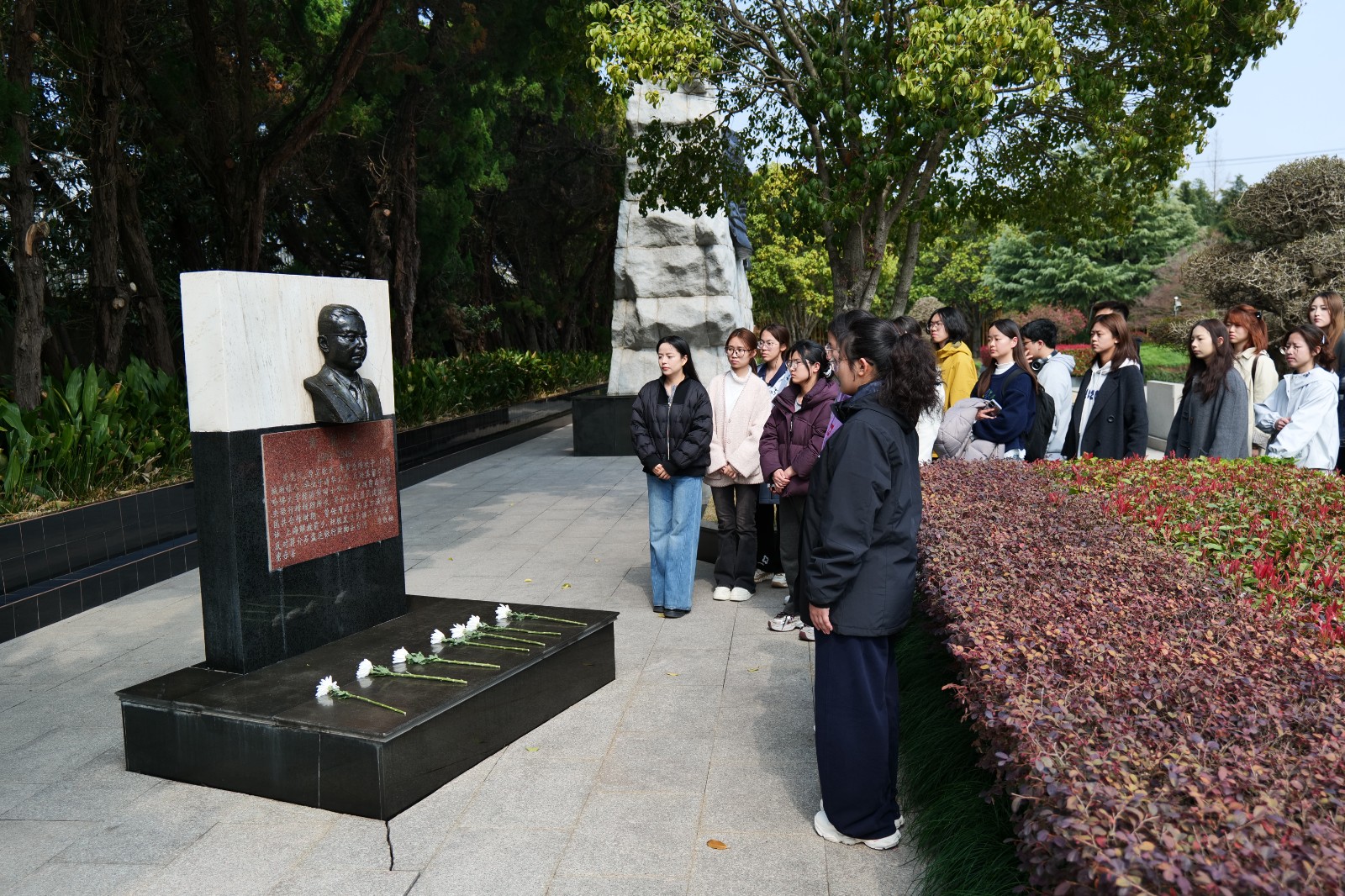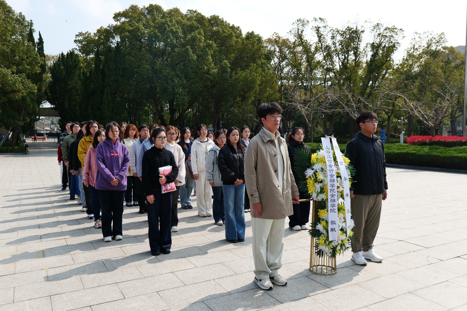 全体师生整齐列队于陵园广场,在纪念碑前肃立,奏唱国歌。学生代表敬献花篮,全体师生默哀,向为民族独立、人民解放和国家富强英勇献身的烈士致以崇高敬意。