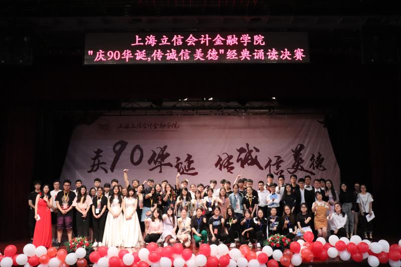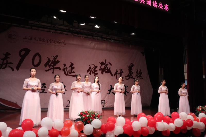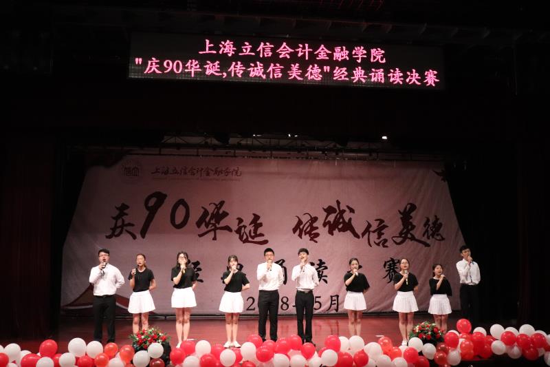 来自各学院及艺术团的9支参赛队伍以“庆90华诞,传诚信美德”为主题展示了精心准备的文章诵读,现场的气氛被激昂的文字、磅礴的配乐点燃。6支晋级决赛的队伍现场抽取经典材料进行即兴朗诵。最后,金融学院勇夺桂冠,统数学院获二等奖,人文艺术学院、国际经贸学院、会计学院获得三等奖,其他3支队伍获得优胜奖。
