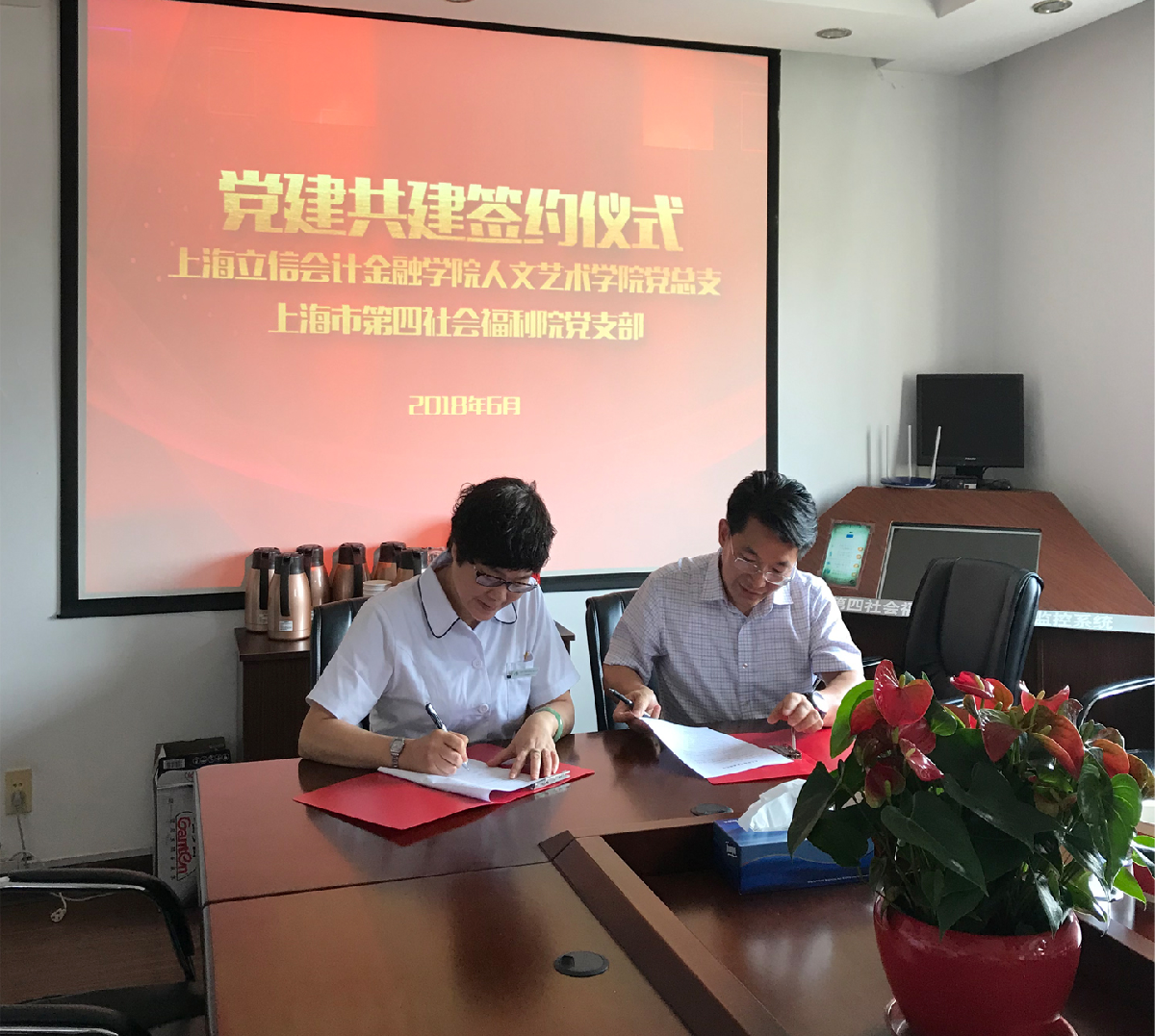 黄敏代表人文艺术学院党总支向第四社会福利院捐赠了供老人们健身用的器械,并为老人们带去由我校学生书画协会创作的对联,祝愿老人们身体健康、晚年幸福。第四社会福利院书记储蓓林介绍了福利院党建工作开展情况及在社会福利事业方面取得的突出成就。双方就开展党建共建活动达成协议,黄敏和储蓓林分别代表双方签署党建共建协议。