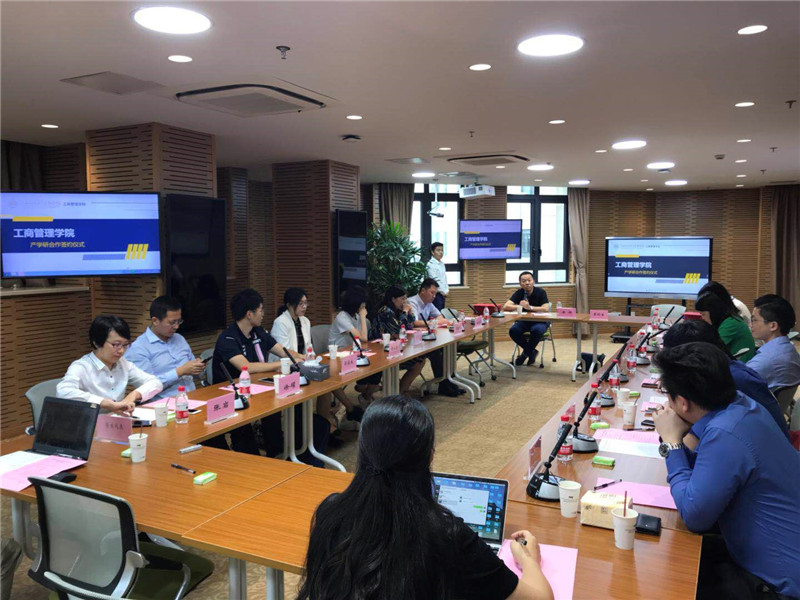 李俊杰向来宾介绍了我校产学研合作现状与政策,邓娜、王凤分别介绍了学校和学院的相关情况,泰隆银行上海分行徐耀行长代表企业致辞。李原副院长代表学院与八家企业代表签署了《产学研战略合作框架协议》。签约仪式后,校企双方围绕如何深入开展校企合作,推进产学研融合进行了广泛细致的研讨。