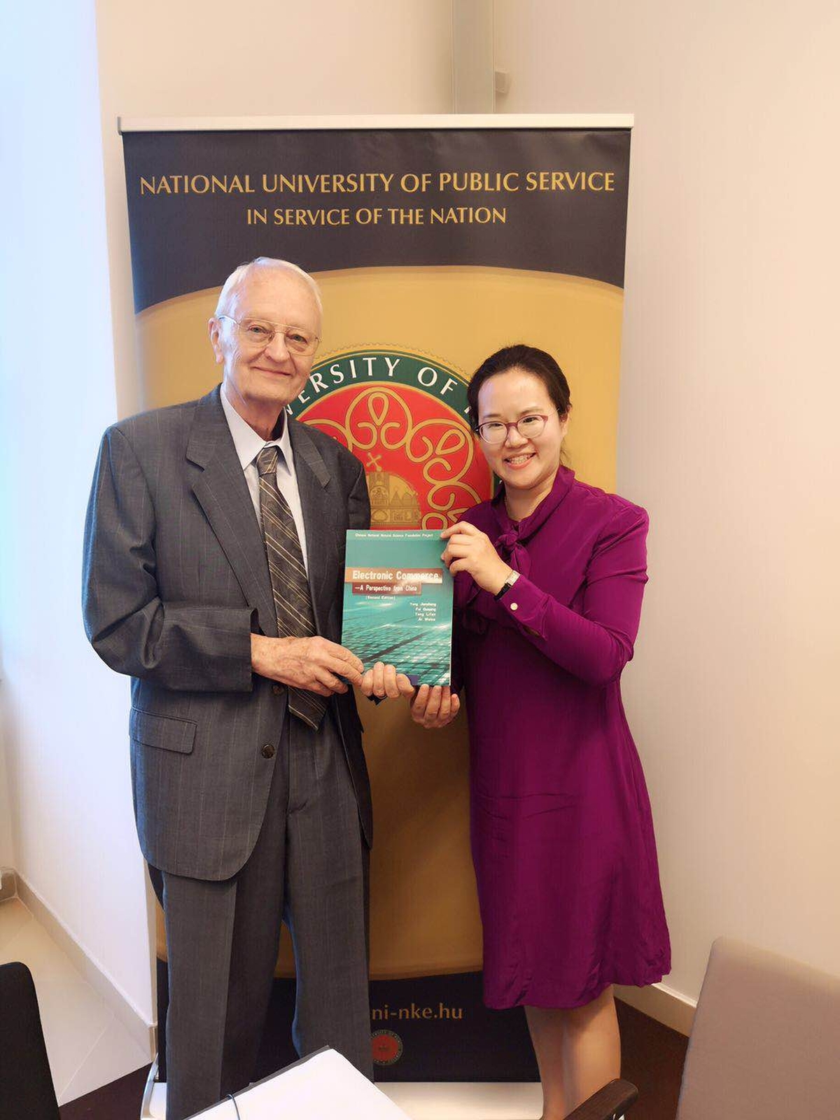 6月28日,在匈牙利国家行政大学(National University of Public Service)举办的“匈-中政治经济关系中的机遇与挑战”研讨会上,华东政法大学商学院副教授杨立钒女士向匈牙利前驻华大使Juhasz Otto先生赠送立信会计出版社出版的全英文著作《电子商务》(第二版)(Electronic Commerce——A Perspective from China(second edition))。该书由杨立钒等编著,2017年2月出版。