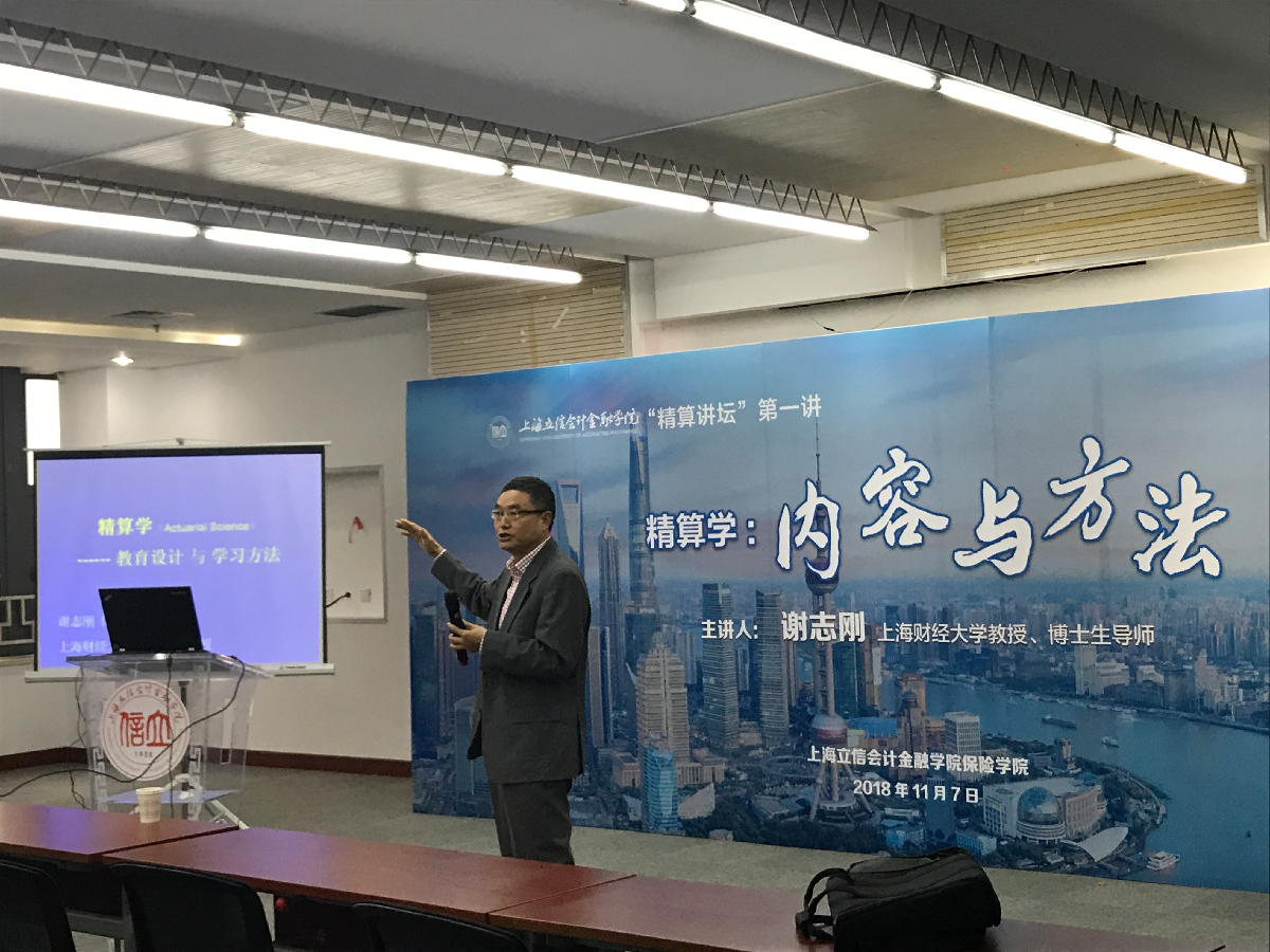 为加深学生对精算学专业的了解,提高其专业认同度和自豪感,11月7日下午,保险学院在学生活动中心201会议室举办了“精算讲坛”第一讲——“精算学:内容与方法”。本期精算讲坛主讲嘉宾为上海财经大学教授、博士生导师谢志刚先生,讲座由保险学院副院长杨青骥主持,精算系系主任李鹏、精算系周佳妮老师以及近百名学生参加了本次活动。