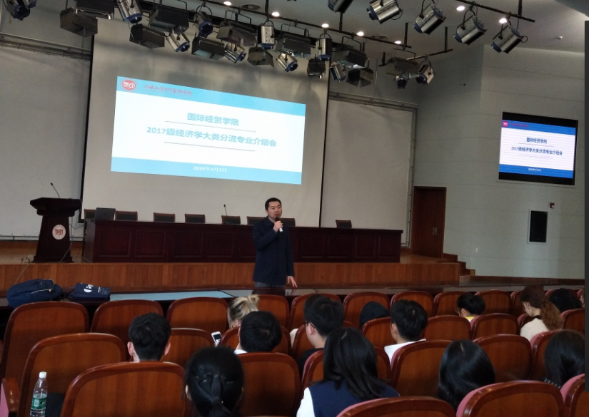 黄伟介绍了大类分流的方案、分流的时间等具体安排。高鸣霞从课程设置、专业特点以及科创比赛等方面向学生进行了详细的专业介绍。饶艳对近两年的国际经济与贸易专业和经济学专业就业、考研、出国、获奖及科创等情况做了介绍,作为学生本次分流的参考。