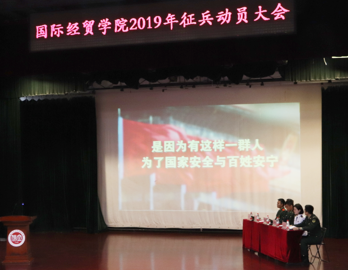 国际经贸学院每年4月都会召开征兵动员大会,旨在对学生进行一次爱国主义和国防教育的同时,通过退伍优秀大学生代表的感染,动员我院适龄学生积极响应国家号召,踊跃报名参军入伍,献身国防事业。