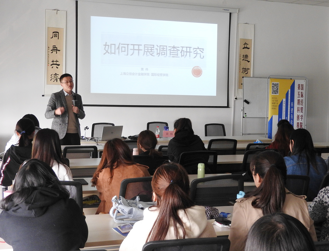 4月3日下午国际经贸学院第五期科创精英训练营第二课在浦东校区举行。讲座由副院长黄伟授课,主题为《如何开展调查研究》。