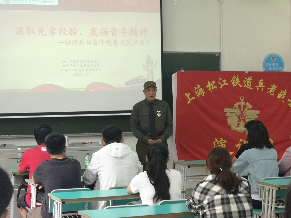 5月29日下午,松江铁道兵老兵演讲团受邀来会计学院,与党史党建学研社成员、会计学院联合一支部党员共同开展“汲取先辈经验,发扬革命精神”交流座谈会。