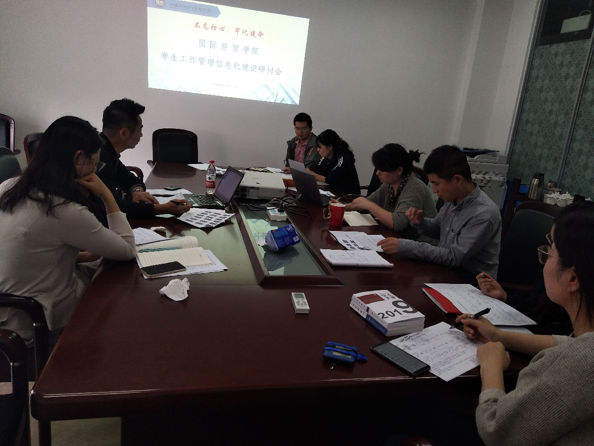 为扎实推动“不忘初心、牢记使命”主题教育深入开展,及时贯彻落实校党委统一要求,推进国际经贸学院学生工作信息化建设。10月15日,国际经贸学院特邀校外专家召开国际经贸学院学生工作信息化建设讨论会,讨论会由学院党总支副书记,副院长饶艳主持,全体学生工作者参加本次讨论会。