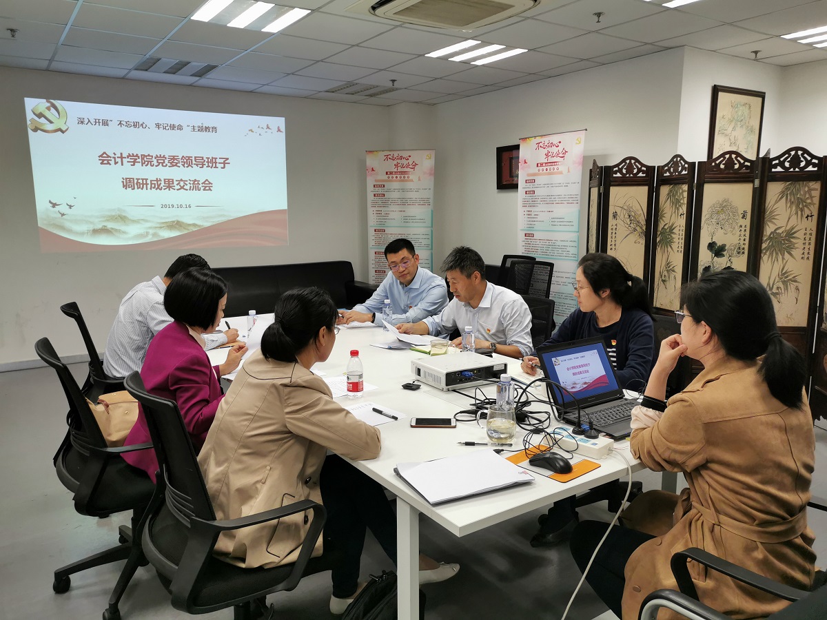 主题教育开展以来,会计学院领导班子深入基层深入实际,广泛听取意见建议,形成了初步调研成果。会上,六位班子成员结合自身工作和调研课题,围绕“基层教工支部在立德树人过程中堡垒作用的发挥”、“课程思政在会计学院具体落实过程中的难点和举措”、“高水平地方应用型大学建设中学科、专业提升的难点与举措”、“聚焦学生培养,提高学生工作管理水平和育人实效”、“科研团队建设和研究生培养的现状、难点与举措”、“一流本科专业建设中打造‘金课’的难点与对策”、“打造与高水平地方应用型大学相匹配的师资队伍面临的难点与对策”等逐一发言,深入查找了工作中存在的问题,剖析了产生问题的原因,提出了改进措施和解决问题的办法。