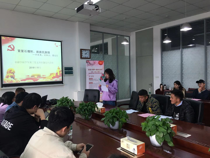 11月21日下午,金融学院学生第三党支部在五教开展主题为 “紧紧石榴籽,浓浓民族情——学政策,谈体会,强站位”的主题党日活动。支部全体党员、金融学院少数民族党员代表以及部分少数民族同学代表参加了此次活动,活动由金融学院学生第三党支部支部书记杨自保主持。