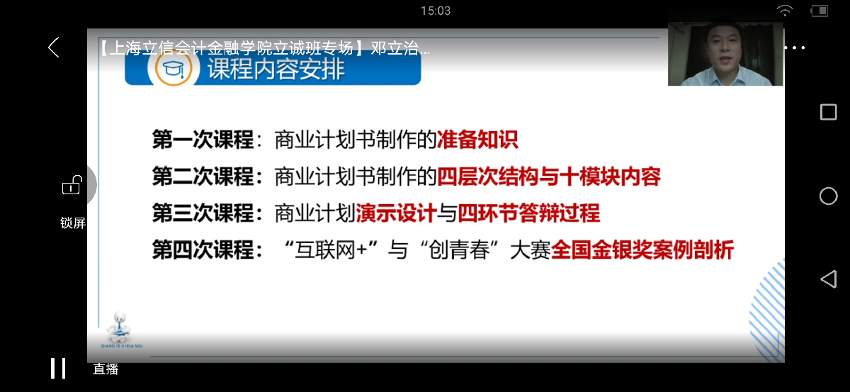 系列课程包括《创新时代,思维制胜》、《上海市大学生创业政策解读》、《创业投资与创业管理》、《商业计划书》、《创业营销兵法》、《创业领导力塑造和组织建设》、《创业别踩法律“坑”》、《用创业书写青春——创业大赛项目酝酿、筹备和构建》等,主讲教师包括中国青年创业导师、上海市创业导师李俊,内蒙古大学秦志宏,北京科技大学邓立治等知名创新创业专家、高校教授和业内人士。