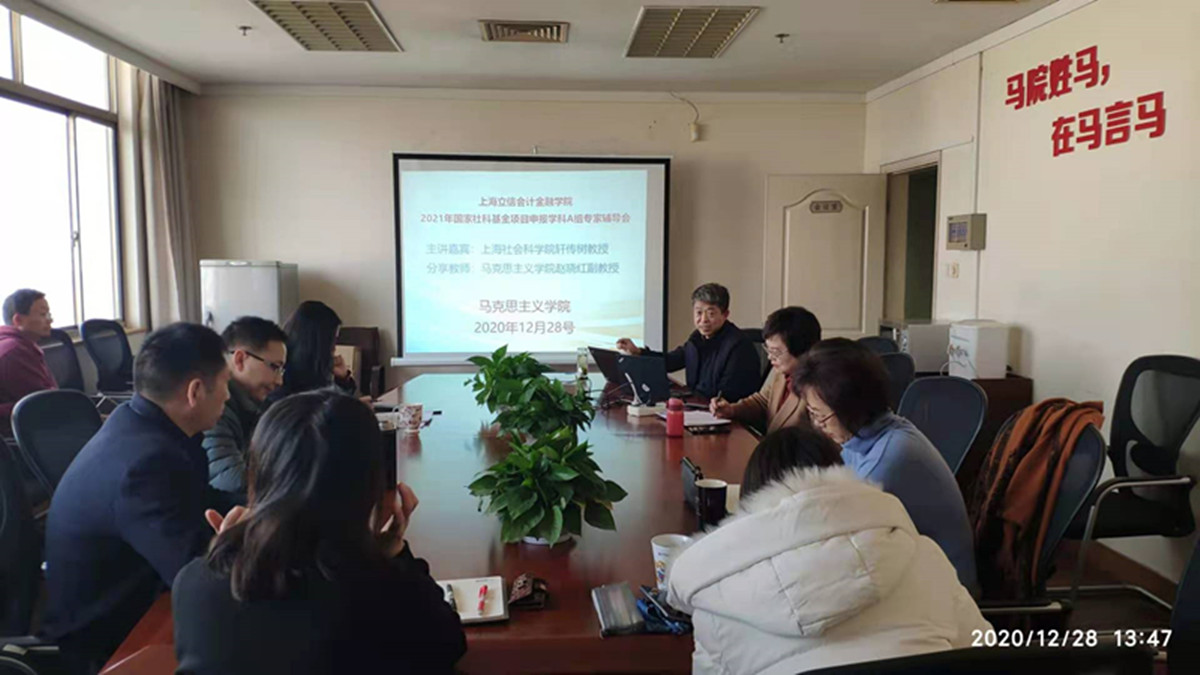 12月28日下午,马克思主义学院组织召开2021年国家社科基金项目申报学科A组专家辅导会。辅导会在松江校区长乐楼室举行,线上线下同步进行,邀请上海社会科学院轩传树教授担任主讲嘉宾。马克思主义学院拟申报A学科组的教师、科研处工作人员及其他学院的教师通过线上线下参加了辅导会。会议由马克思主义学院副院长张润主持。